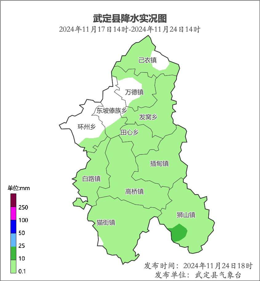 2024年11月17日14时~11月24日14时,统计全县27个自动气象站资料,全县平均降雨2.6毫米,其中无降雨6站,10.0毫米以下20站,10.0~25.0毫米1站,最大降雨量出现在狮山镇羊旧11.8毫米。各乡(镇)降雨量(毫米):狮山6.0、高桥3.2、猫街3.1、插甸2.3、白路3.2、田心1.1、发窝3.4,其中环州、东坡、万德、己衣无降雨。