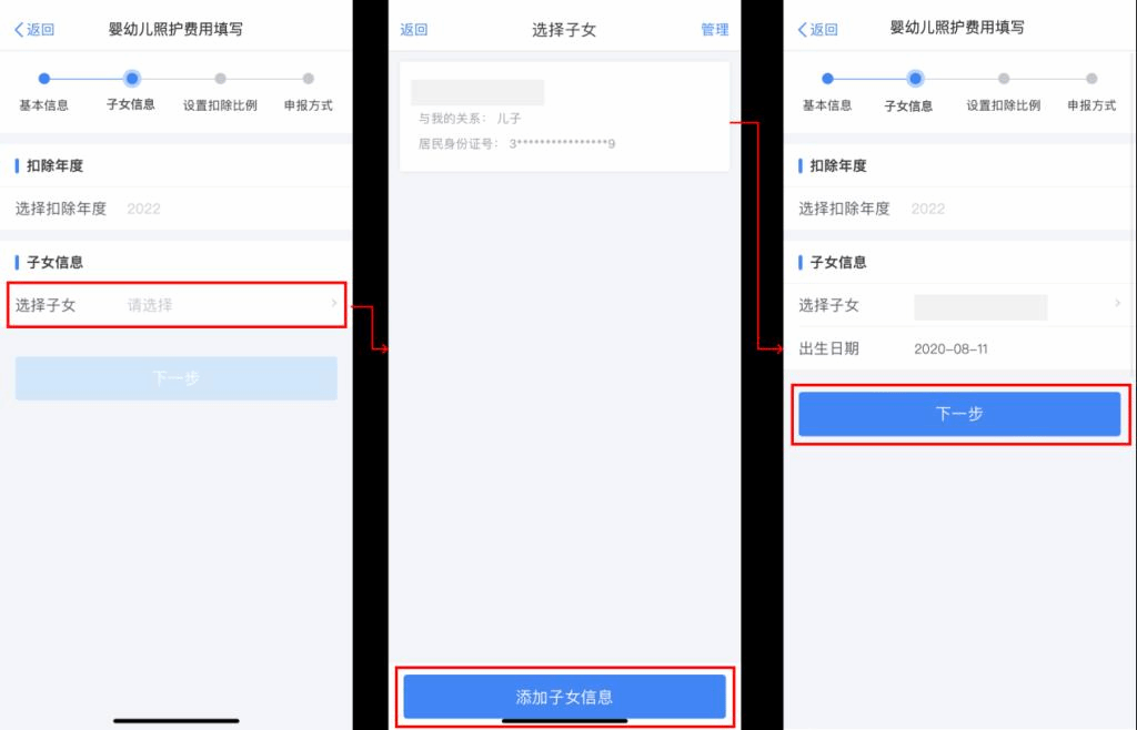 纳税人选择子女后,将回到“子女信息”界面,并显示子女的姓名与出生日期,子女信息确认无误后,点击“下一步”。