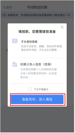第二步,选择扣除年度。进入申报界面后,“选择扣除年度”设为2022年,点击“确认”后,系统会提示需要提前准备的资料,纳税人仔细阅读后,点击“准备完毕,进入填报”。