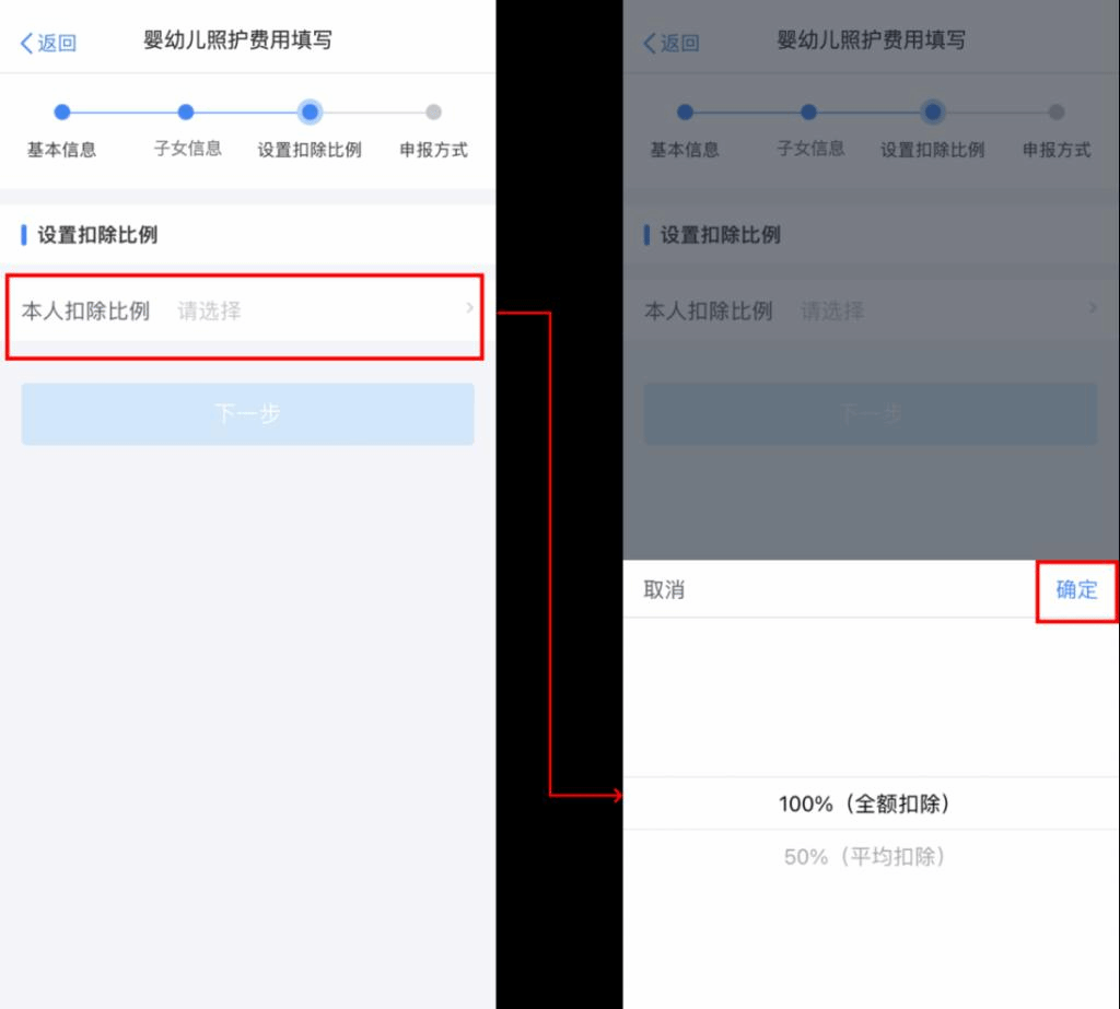 第四步,设置扣除比例。完成子女信息填写后,纳税人根据实际情况在“本人扣除比例”中选择100%(全额扣除)或50%(平均扣除)其中一种。选择完成并确定后,点击“下一步”。