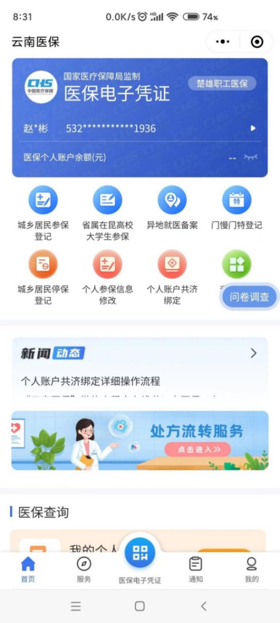 登录后可以看到这样的界面,如正下方的“医保电子凭证”,使用电子凭证是十分方便、快捷的,可以不用带社保卡直接就诊。职工到药店购药也可以直接用电子凭证。(使用手机有困难的,我县县级及各乡镇卫生院均可通过医保扫脸支付进行医保结算报销)