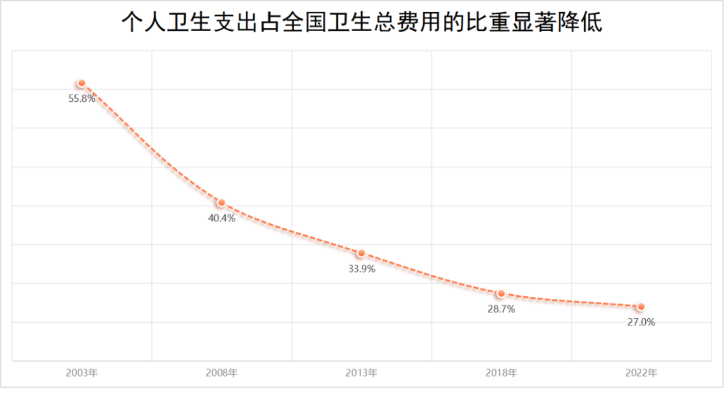 在不断完善的医保制度的有力支持下,全国居民就医需求快速释放,健康水平显著提升。据统计,2003至2022年,我国医疗卫生机构总诊疗人次数从20.96亿人次增长至84.2亿人次;全国居民平均预期寿命从2005年的72.95岁增长到2020年的77.93岁。与此同时,个人卫生支出占全国卫生总费用的比重却从2003年的55.8%大幅下降至2022年的27.0%。近14亿医保参保人享受更高水平的医疗条件、更大范围的医疗保障、更高比例的医保报销、更为便利的医保服务的背后,是中国医保制度为人民生命健康的保驾护航。