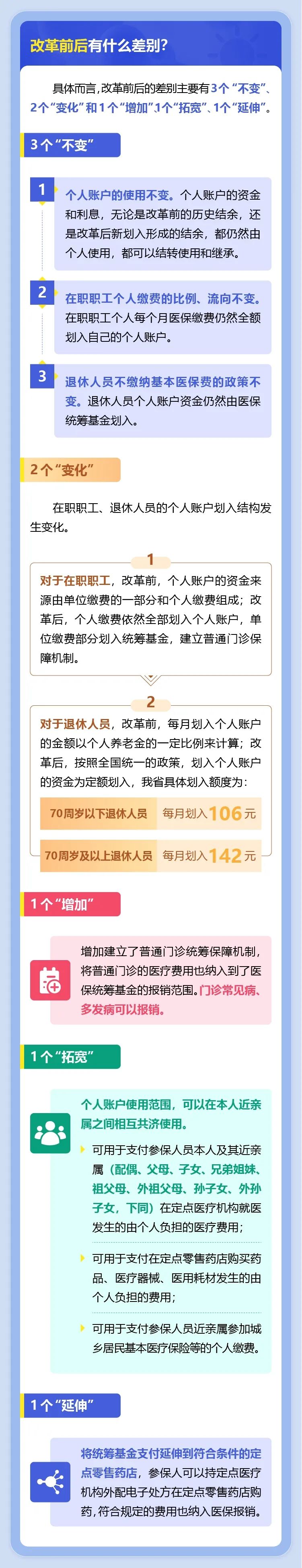 我省在2022年4月1号启动了职工医保门诊共济保障改革,以《暂行办法》为指导,建立了普通门诊费用统筹保障机制,将职工普通门诊医疗费纳入医保报销范围,调整在职职工个人账户计入标准,将个人账户使用范围由参保人本人扩展到配偶、父母、子女等家庭成员。