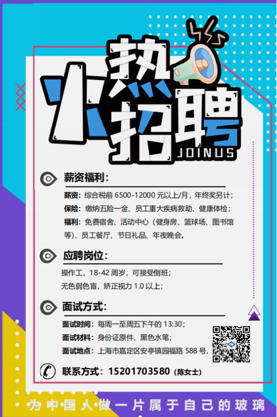 18周岁—45周岁,招聘工种有普工、操作工、技术人员等,工资5000-12000。有PVB生产相关经验优先。有五险一金、提供住宿有餐补、年终奖、生日福利等。