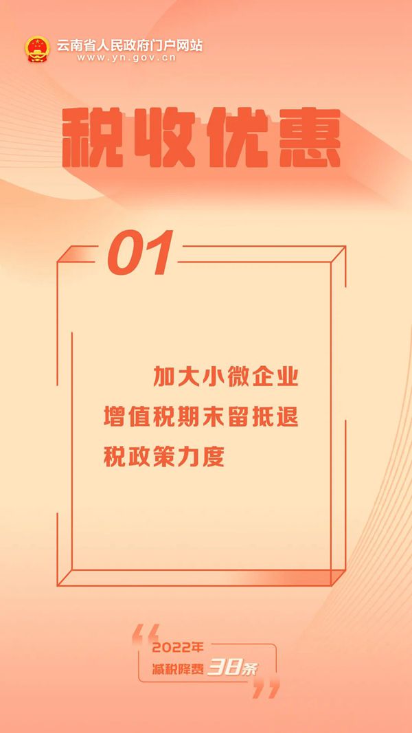 即日起,云南省人民政府门户网站和微信公众号推出“2022年减税降费38条”专栏,聚焦减税降费相关政策,帮助企业和个人更好地了解政策、掌握政策、用好政策,最大程度释放政策红利、激发市场活力、稳定市场信心。