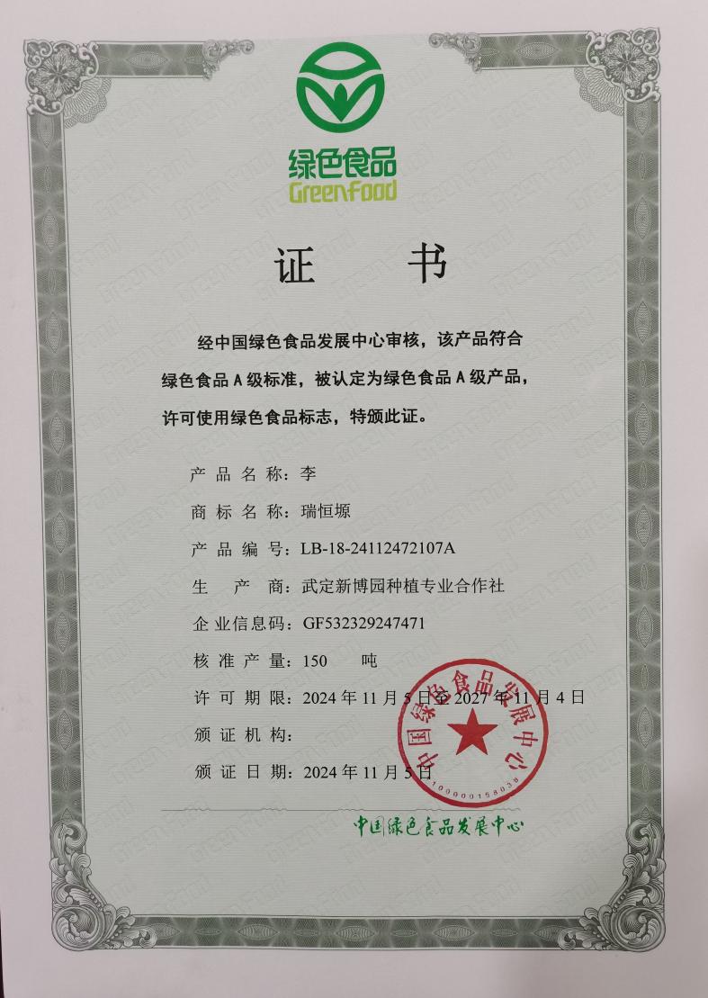 近日,武定新博园种植专业合作社申报的李、桃、梨三个产品正式取得中国绿色食品发展中心颁发的绿色食品证书,认定为绿色食品。