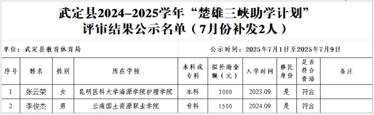 2024-2025学年7月拟补发“楚雄三峡助学计划”学生2人(张云荣、李俊杰)共计3500元,具体名单如下: