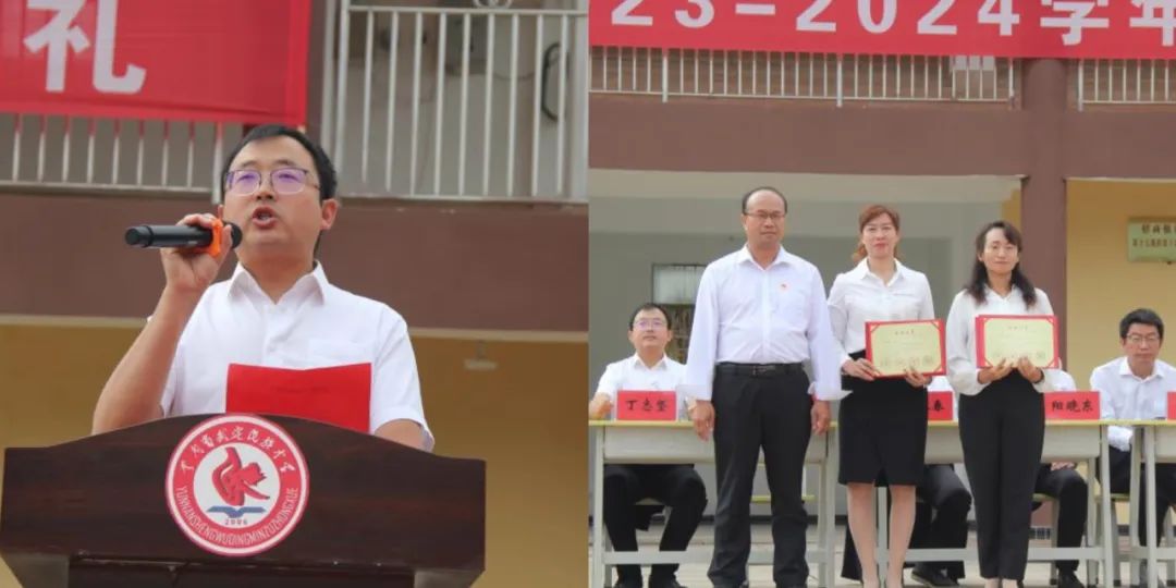 丁志坚副校长宣读获奖教师名单,我校李沁娜老师和尹太美老师在第十二届全国初中语文教师教学基本功大赛中取得优异成绩,张平校长为获奖教师颁发荣誉证书。