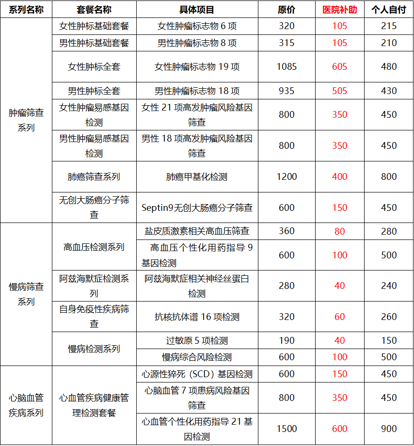 随着社会的发展和人们生活水平的提高,肿瘤的发病率也在不断上升。如何在肿瘤发病前就能预知发病风险?最有效的肿瘤预防就是防患于未然。环境和遗传共同作用,可导致肿瘤的发生,对于环境因素我们无法预测,但肿瘤遗传的机制我们却有迹可循。通过对肿瘤的易感基因进行检测,评估受检者罹患某种癌症的风险,提醒受检者制定具有针对性的个人体检方案,指导改善生活习惯,个性化的预防肿瘤发生。男/女肿瘤标志物可实时检测全身肿瘤标志物的分泌情况,及时发现并提示肿瘤风险,是较为经济实惠的肿瘤筛查套餐。无创大肠癌则是针对外周血中细胞甲基化的特征,灵敏的评估受检者肠道是否有癌变或者发生癌前病变的可能。肺癌甲基化则用于肺结节的排筛,取样方便且灵敏度高。