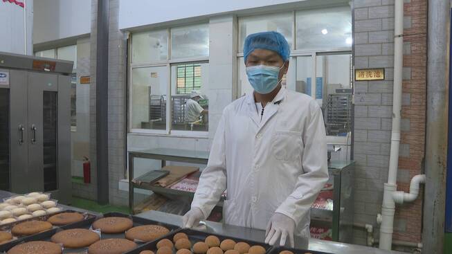 武定县云吉祥食品有限公司经理王平:这是我公司今年推出的鸡枞云腿月饼,我们采用新鲜的鸡枞油炸后加入两年的火腿,纯手工制作,我们今年制作的火腿月饼外观圆润饱满,色泽也比较好, 要感谢供电部门对我们的大力支持,长期以来我们这里供电电压比较稳定,所以我们烤出来的产品色泽比较稳定。