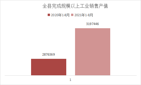 1-8月,全县规模以上工业总产值总计(现行价格)3329697千元,同比增长11.5%;规模以上工业销售产值总计(现行价格)3197446千元,同比增长11.2%。