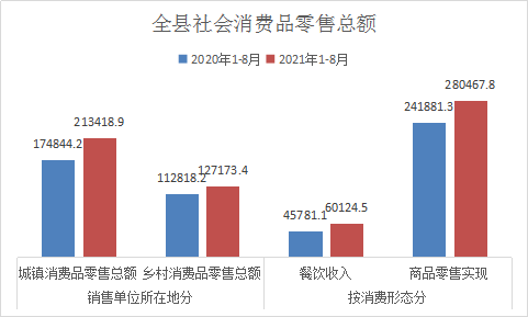 1-8月,全县社会消费品零售总额实现340592.3万元,同比增长18.4%。其中按销售单位所在地分城镇消费品零售总额实现213418.9万元,同比增长22.06%,乡村消费品零售总额实现127173.4万元,同比增长12.72%;按消费形态分餐饮收入实现60124.5万元,同比增长31.33%,商品零售实现280467.8万元,同比增长15.95%。