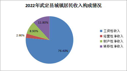 城镇居民人均可支配收入45202元中,工资性收入34553元,占比76.4%;经营性净收入1304元,占比2.9%;财产性净收入4012元,占比8.9%;转移性净收入5333元,占比11.8%,工资性收入占比高达四分之三以上。