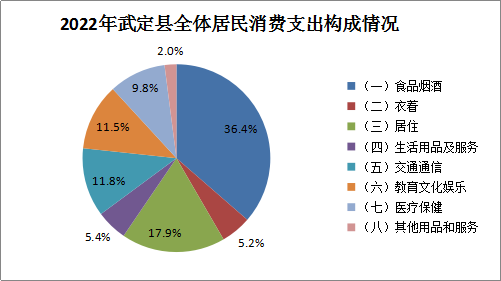 2022年我县全体居民人均消费支出17912元,比上年增长3.1%,其中城镇居民人均消费支出27875元,较上年减3.9%;农村居民人均消费支出13369元,较上年增8.0%。全体居民八大类支出中,食品支出6519元,增3.0%,占比36.4%;衣着支出937元,增3.1%,占比5.2%;居住支出3204元,减4.1%,占比17.9%;家庭用品及服务支出958元,增4.2%,占比5.4%;交通和通信支出2118元,增9.9%,占比11.8%;教育文化娱乐支出2055元,减1.5%,占比11.5%;医疗保健支出1758元,增17.4%,占比9.8%;其他杂项消费支出363元,减0.7%,占比2.0%,消费结构更加理性合理。