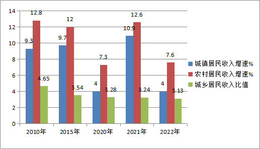 2010年农村居民人均可支配收入增速为12.8%,高城镇居民3.5个百分点,城乡居民收入比为4.65:1;2015年农村居民人均可支配收入增速为12.0%,高城镇居民2.3个百分点,城乡居民收入比为3.54:1;2020年农村居民人均可支配收入增速为7.3%,高城镇居民3.3个百分点,城乡居民收入比为3.28:1;2021年农村居民人均可支配收入增速为12.6%,高城镇居民1.7个百分点,城乡居民收入比为3.24:1;2022年农村居民人均可支配收入增速为7.6%,高城镇居民3.6个百分点,城乡居民收入比为3.13:1。城乡收入比由2010年的4.65:1下降至目前的3.13:1,比值缩小1.52。城乡收入比进一步收窄,城乡收入差距明显缩小。