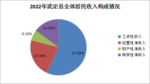 2022年全体居民人均可支配收入24060元中,工资性收入13710元,占比57.0%;经营性净收入5298元,占比22.0%;财产性净收入1457元,占比6.1%;转移性净收入3595元,占比14.9%,工资性收入占比达一半以上。