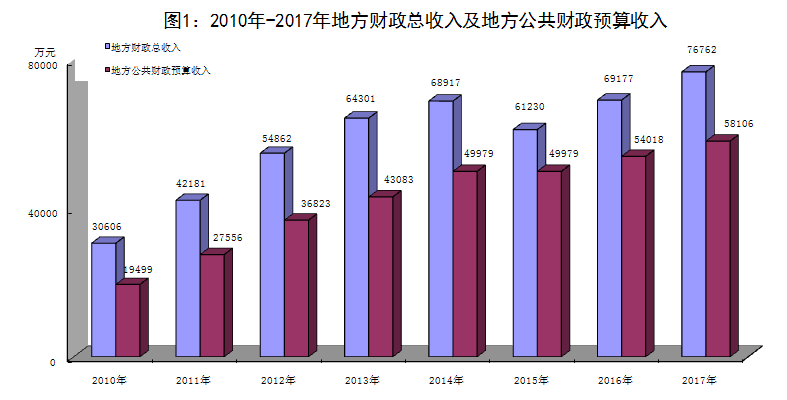 全年完成财政总收入76762万元,增长10.96%。一般公共预算收入58106万元,增长7.57%;其中:税收收入33965万元,增长13.22%;非税收入24141万元,增长0.51%。一般公共预算支出236617万元,增长11.04%。
