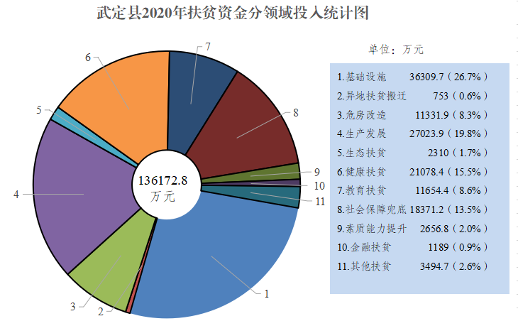一是准确把握政策,加强资金统筹整合。深入践行和完善扶贫资金管理政策内涵,结合武定实际,强化扶贫资金管理,加大扶贫资金整合力度,积极破解扶贫资金管理瓶颈问题,全面落实扶贫资金绩效管理措施,最大限度发挥财政资金的效益,确保财政扶贫资金安全、高效运行。全年共投入扶贫资金136172.8万元,其中:中央财政投入106294.9万元,省级财政投入11976万元,州级财政投入7599.8万元,县级财政投入1432.4万元,沪滇帮扶资金投入5835万元,招商银行定点扶贫资金投入2410.2万元;其他社会捐赠和企业帮扶资金投入624.4万元。各级财政资金累计投入127303.1万元,占投入资金总量的93.5 %。