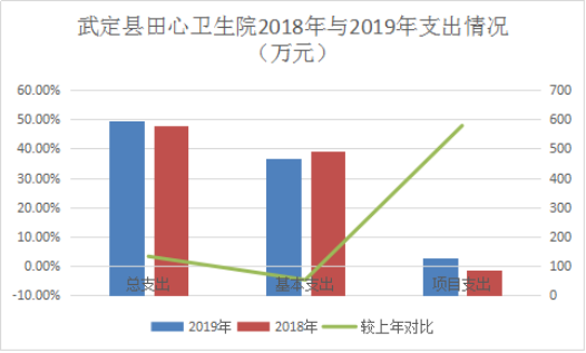 武定县田心卫生院部门2019年度支出合计595.74万元,较上年增加了18.93万元,同比增长了3.28%。其中:基本支出466.07万元,占总支出的78.23%,较上年减少了22.96万元,同比下降了4.70%;项目支出129.67万元,占总支出的21.77%,较上年41.9万元,同比增长了47.74%;上缴上级支出、经营支出、对附属单位补助支出共0万元,占总支出的0%。主要原因分析为公共卫生和健康扶贫投入增大,同时落实中央八项规定,缩减人员支出,过紧日子。