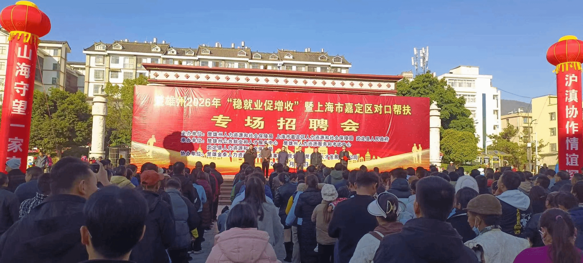 为持续巩固和深化武定县与上海市嘉定区对口帮扶成果,多渠道挖掘就业潜力,促进就地就近就业与重点群体实现高质量充分就业。2026年1月22日,楚雄州人力资源和社会保障局与嘉定区人力资源和社会保障局携手,在武定县体育馆外民族文化广场成功举办“楚雄州2026年ʻ稳就业促增收’暨上海市嘉定区对口帮扶专场招聘会”。
