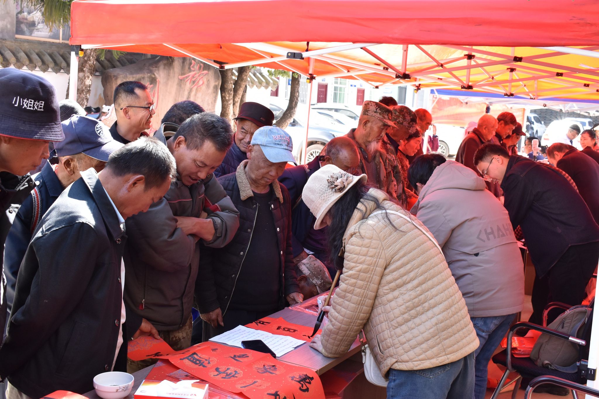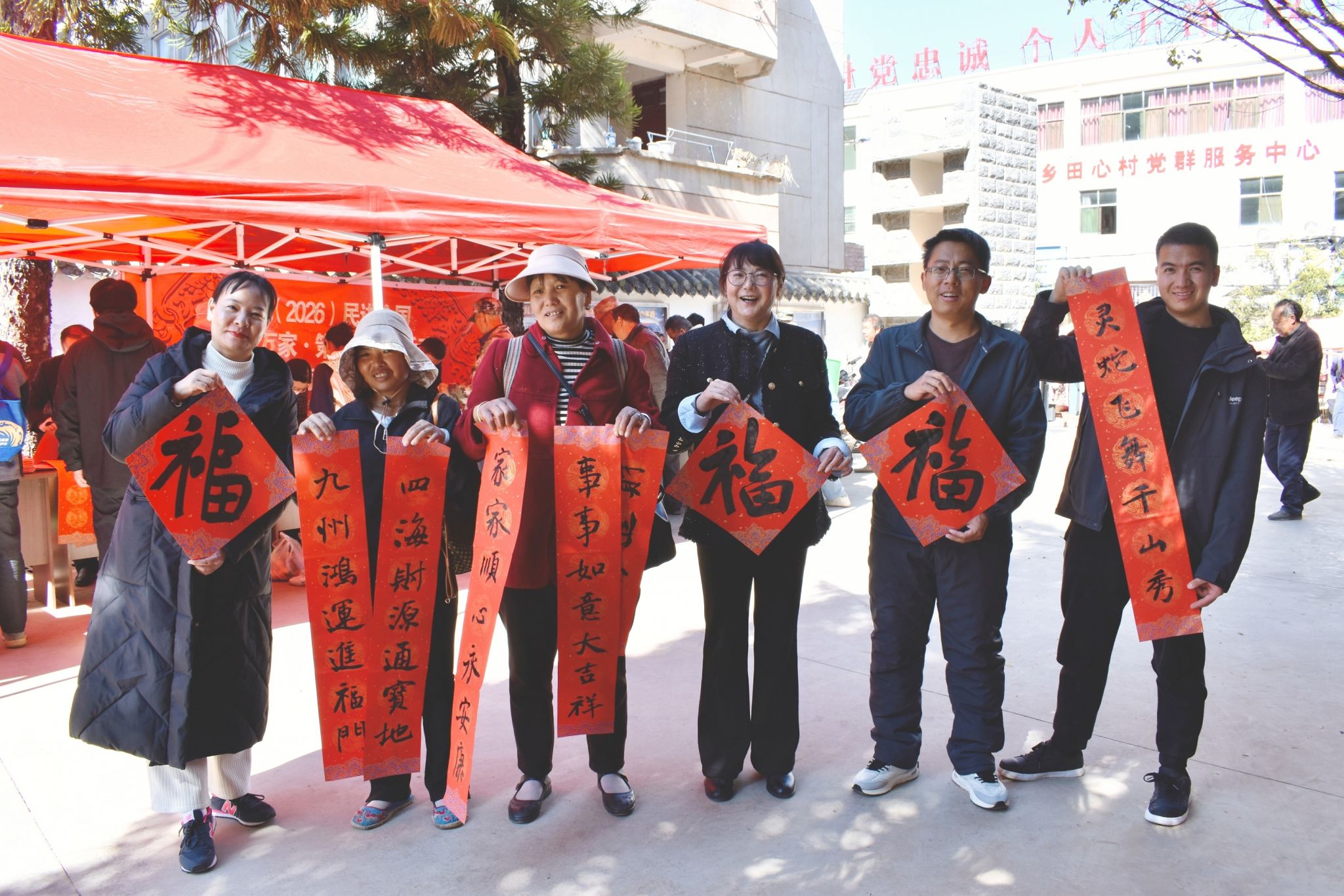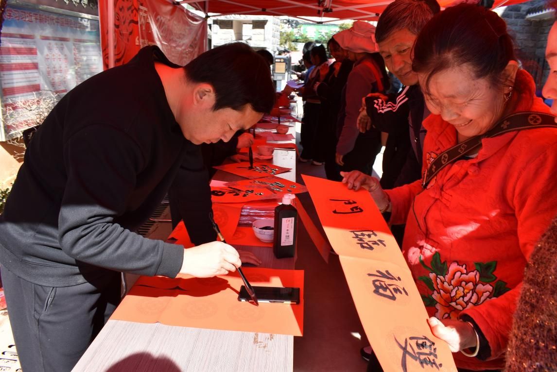 义诊同时,楚雄民进开明画院的5位书法老师同步开笔,铺纸研墨、挥毫泼墨,为群众免费书写春联和“福”字。一副副寓意吉祥的春联、一个个苍劲有力的“福”字新鲜出炉,墨迹未干便被争相领取。“手写的春联才有年味,贴在家里又喜庆又暖心,谢谢老师们送的新年祝福!”拿到春联的村民笑意盈盈,红火的春联映衬着幸福的脸庞,勾勒出冬日里温馨的乡村图景。