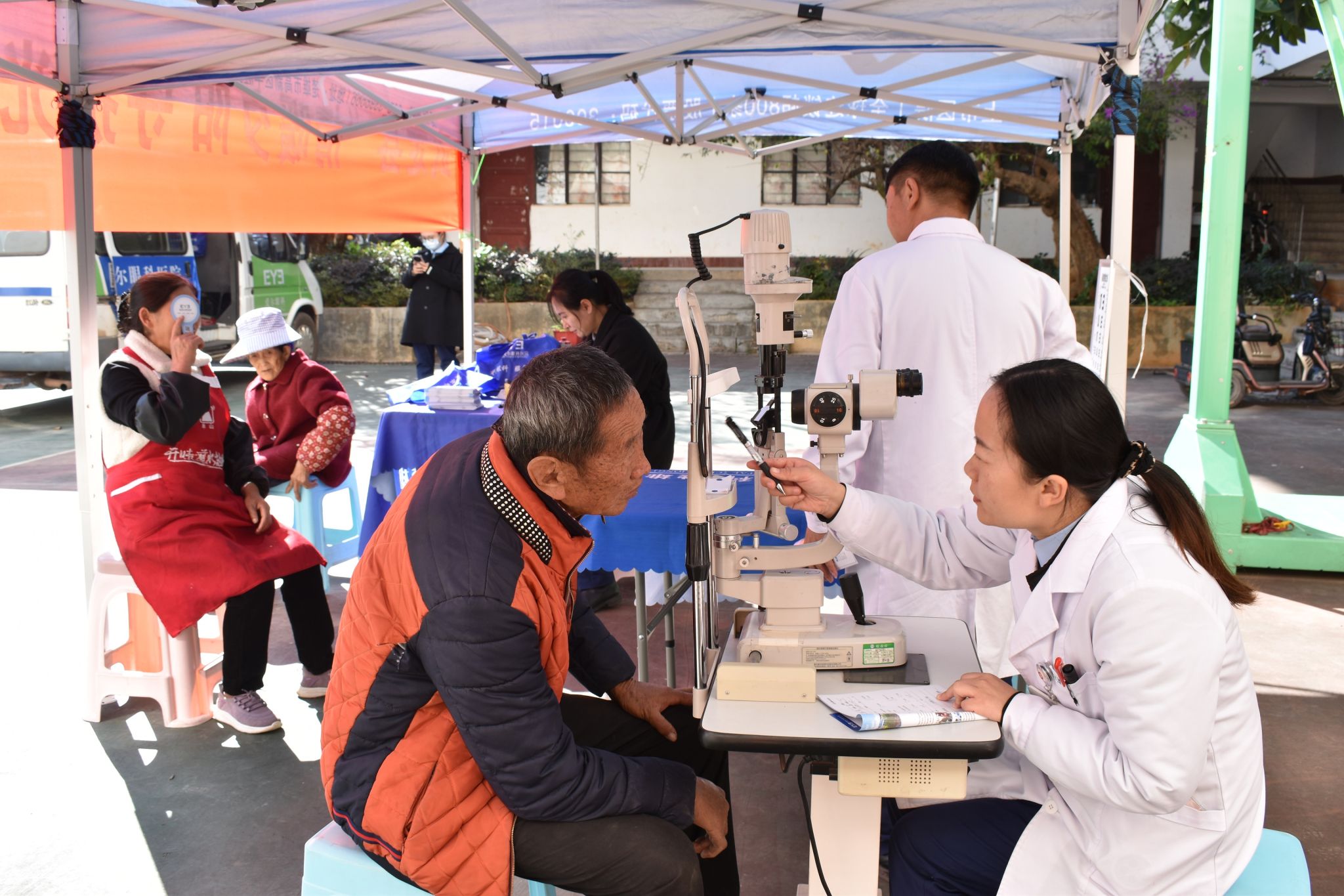 上午十点,田心乡政府院子里暖意涌动,楚雄爱尔眼科医院医护团队早早搭起义诊台,闻讯而来的群众有序排队等候。医护人员为大家逐一开展视力检测、电脑验光、裂隙灯检查,重点筛查白内障、青光眼等老年常见眼病,同时一对一答疑解惑,普及科学用眼和眼部保健知识。