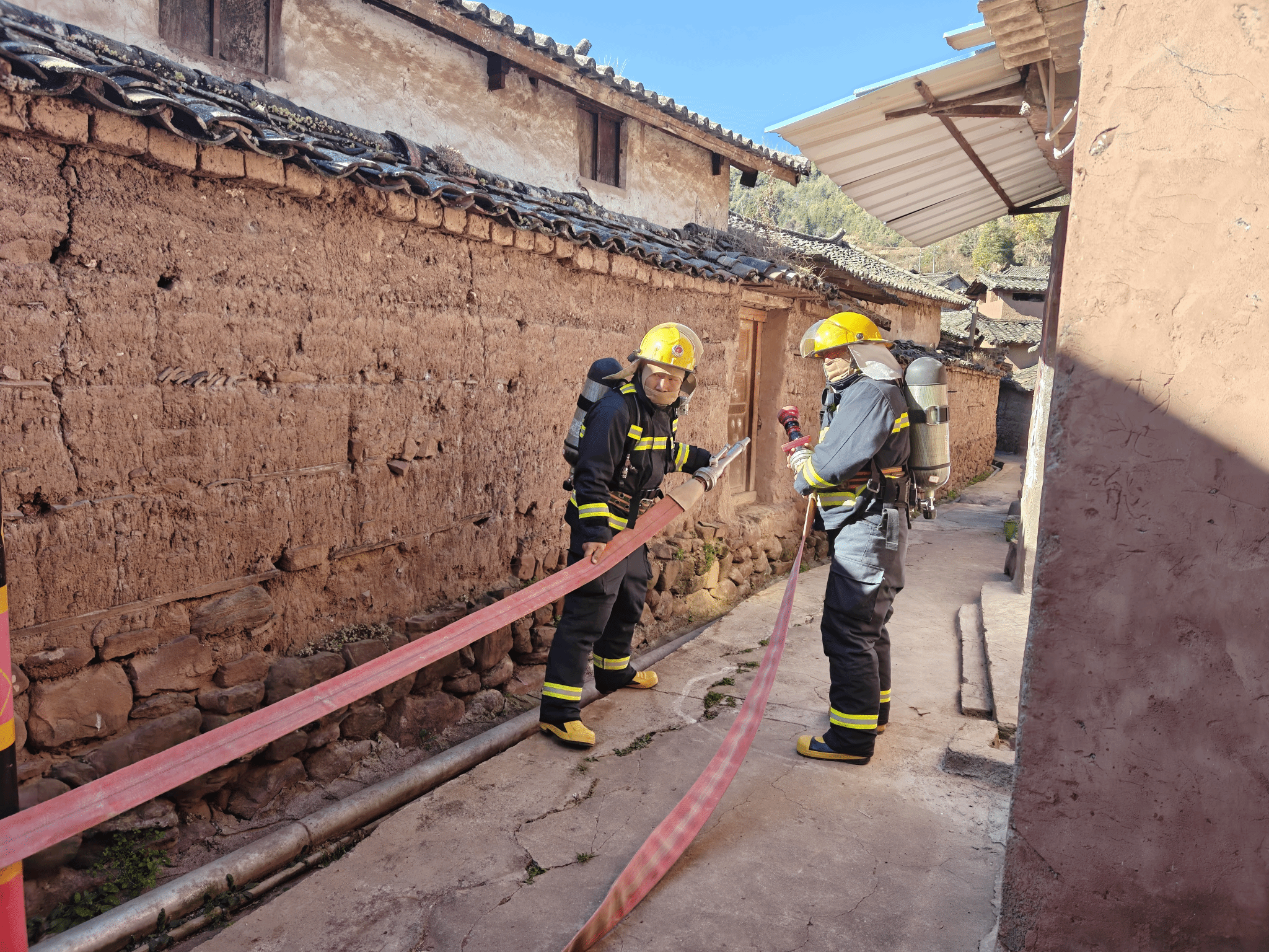 演练前,消防指战员实地勘察村落巷道布局、古建筑结构特点,重点排查消防水源、疏散通道、电气线路等关键部位隐患,并与村落负责人、志愿消防队员深入交流,了解日常防火巡查重点和应急处置难点。