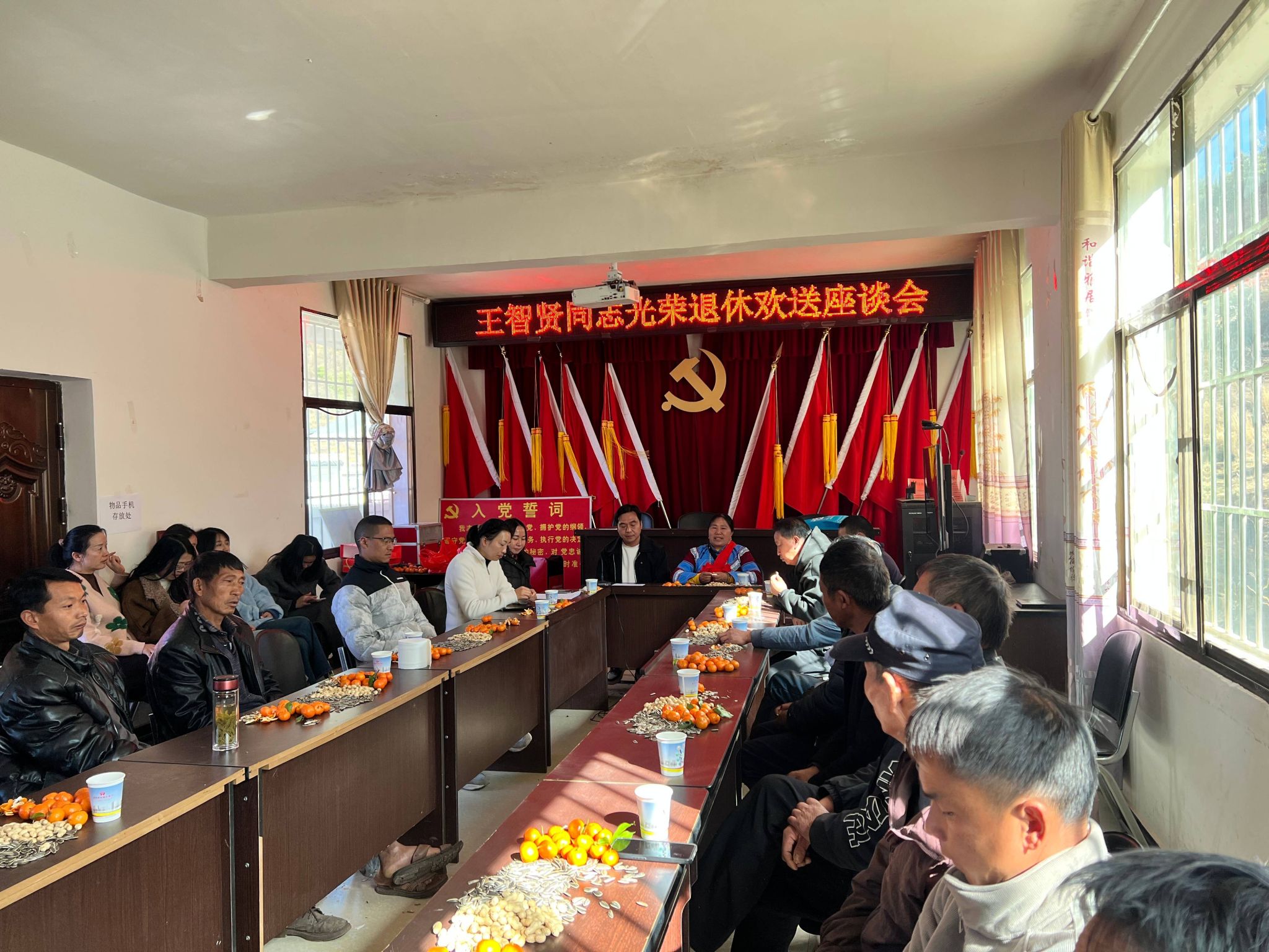 2026年2月5日,环州村委会会议室温情洋溢。乡、村干部与群众欢聚一堂,为王智贤同志举行光荣退休座谈会。佩戴红花、手捧证书的她笑容温暖而笃定,窗外平坦的村路、整洁的文化广场与整齐的安居房相映,共同见证她扎根乡土二十五载的峥嵘岁月。