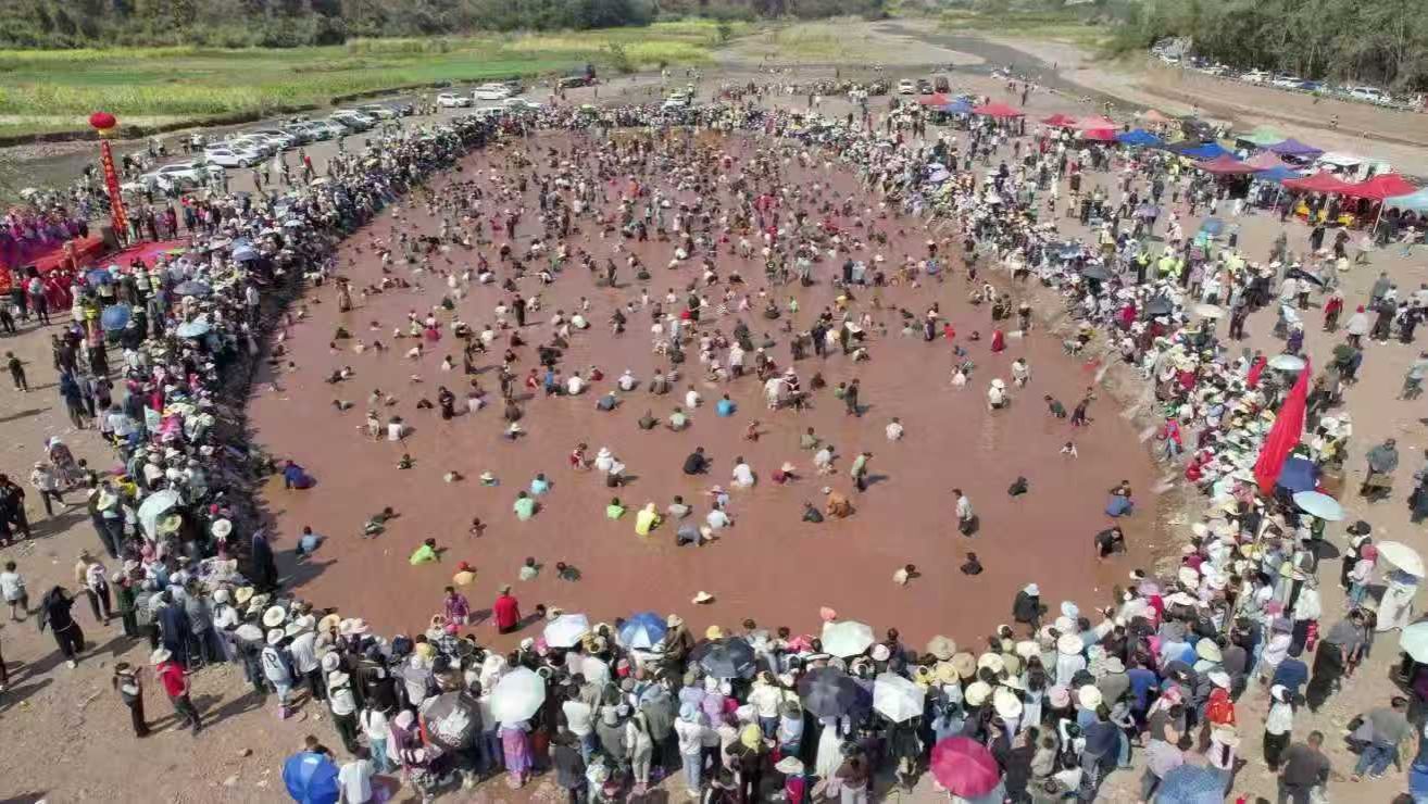 农历大年初二,暖阳照耀下的武定县东坡傣族乡勐果河畔彩旗飘扬、人声鼎沸。备受期待的第八届勐傣奥巴节在此盛大启幕,万名各族群众和游客从四面八方汇聚而来,共赴这场“逐鱼之乐”的新春盛宴。
