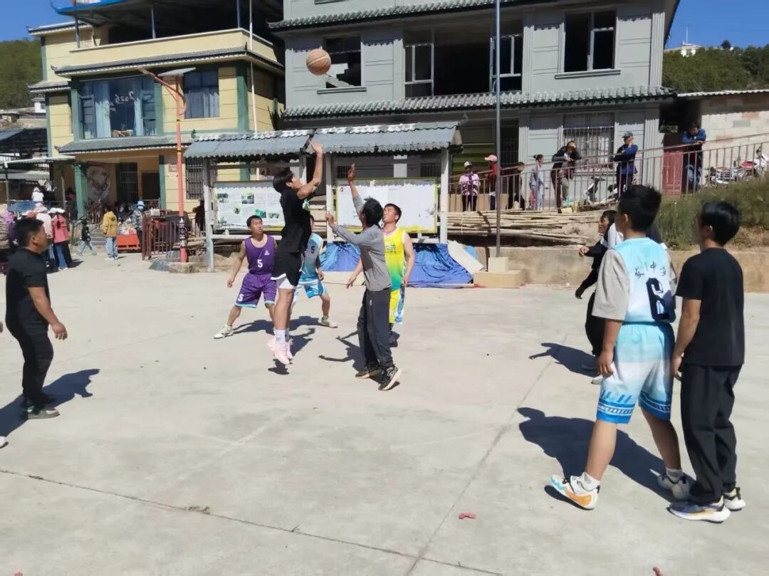 伴随着孩子们的欢声笑语,一旁的篮球场上,年轻人们精神抖擞、斗志昂扬,传球、运球、投篮动作一气呵成,队员之间配合默契、奋勇拼搏。赛场上你来我往、激烈角逐,每一次精准投篮都引来阵阵喝彩;赛场下掌声雷动、欢呼不断,各族群众并肩观战,情谊在欢声笑语中不断升温。