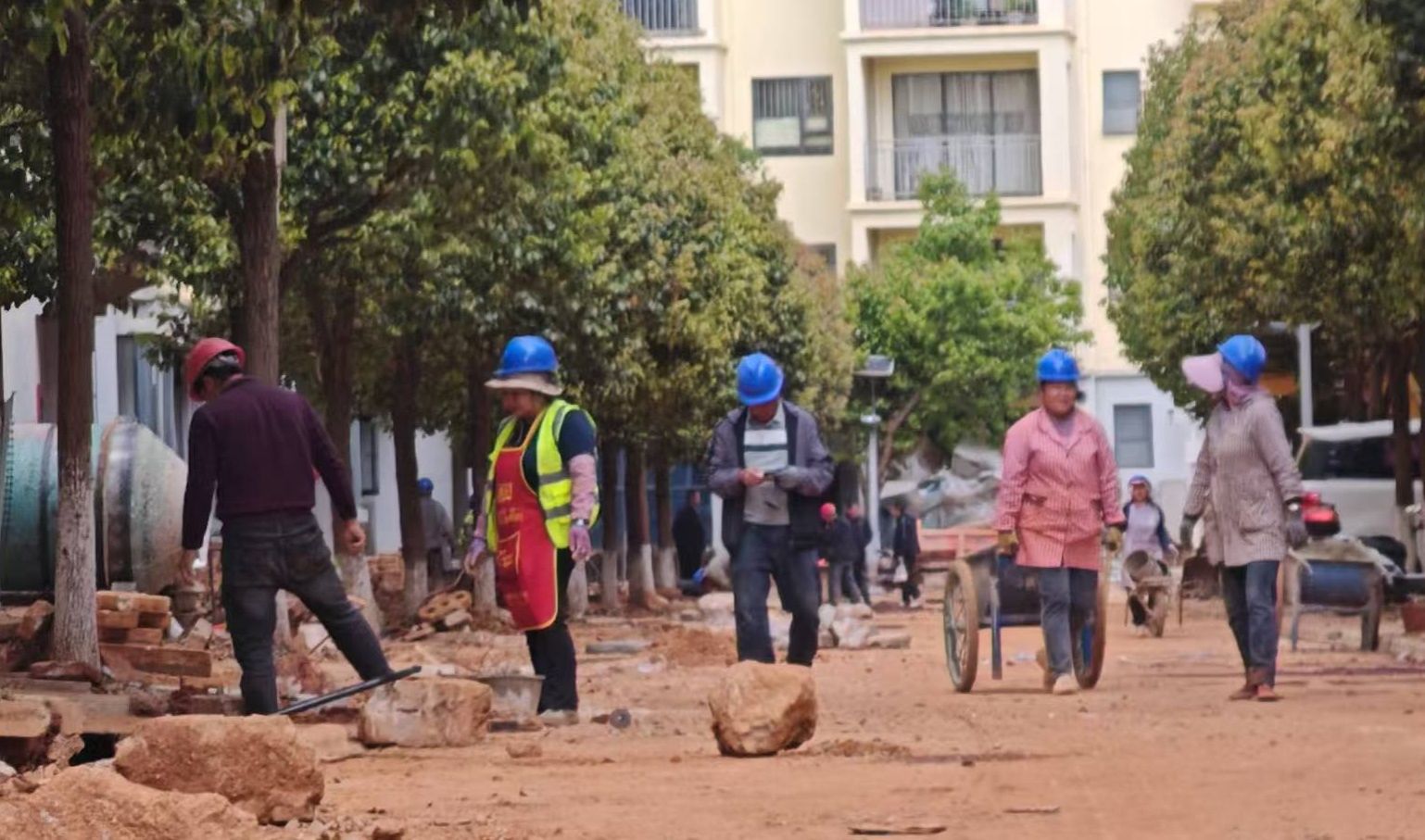 52岁的文云环负责填土清运:“以前山里种地靠天吃饭,现在住楼房还能参与社区建设,每天领工资,心里踏实。看着管道一天天铺好,就像家一点点变美,再累也甜。”