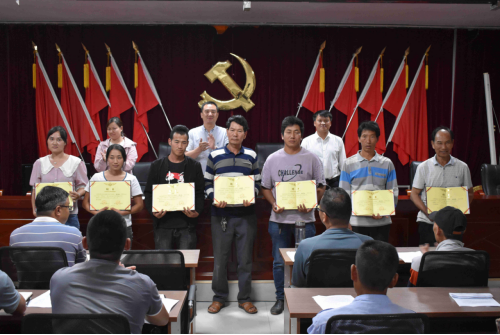 信用社相关人员耐心细致讲解金融贷款政策,乡党委副书记、乡人民政府乡长杨成武宣读田心乡聘用技术指导“牛博士”的决定,在主席台就座的领导为聘用的10名技术指导“牛博士”颁发聘书。