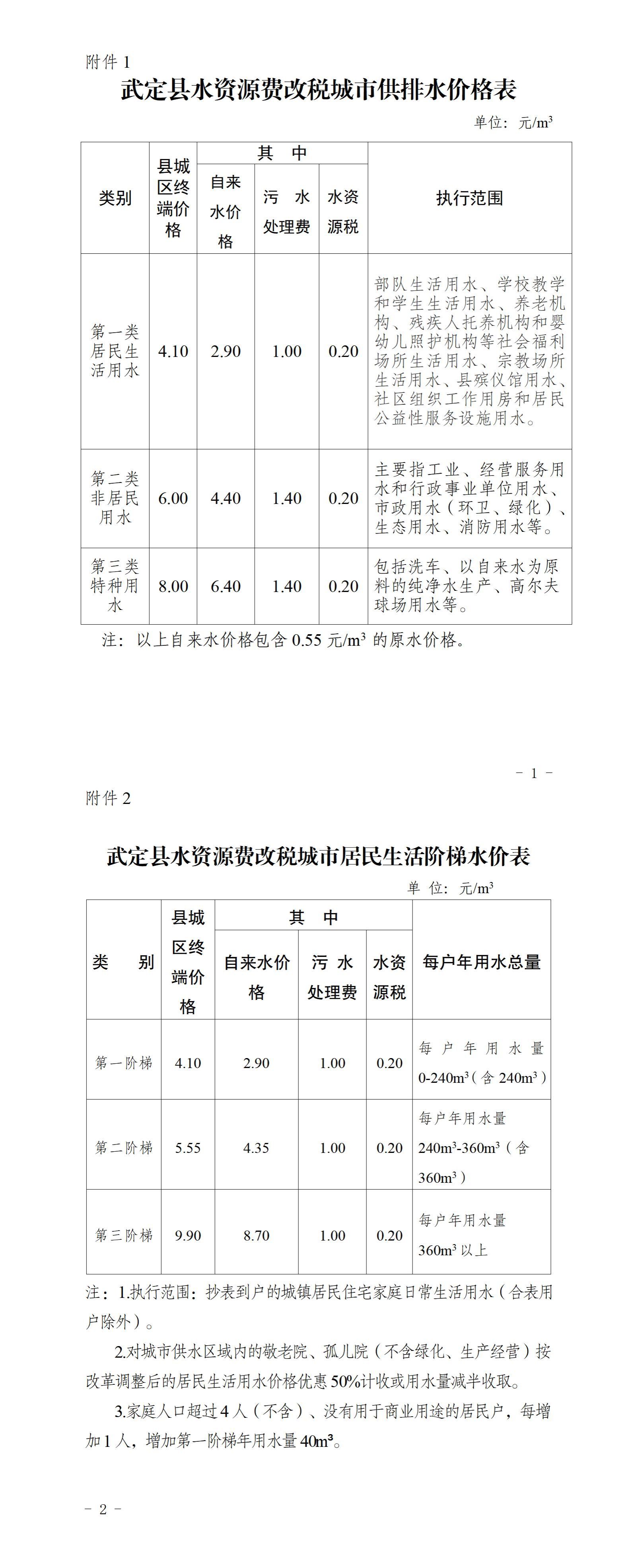 根据《财政部 税务总局 水利部关于印发<水资源税改革试点实施办法>的通知》(财税楚〔2024〕28 号)《云南省财政厅 国家税务总局云南省税务局 云南省水利厅关于云南省水资源税改革试点有关事项的公告》(云财规〔2024〕18 号)有关水资源费改税的要求,决定将武定县城市供水价格所含的水资源费 0.20元/立方米调整为水资源税,调整后供排水终端价格按附件1和附件2执行。现就有关问题通知如下:
