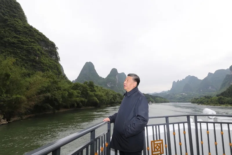 4月25日至27日,中共中央总书记、国家主席、中央军委主席习近平在广西考察。这是25日下午,习近平在桂林市阳朔县,乘船考察漓江阳朔段。新华社记者 鞠鹏 摄