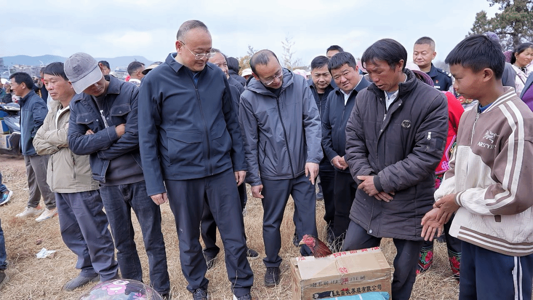 随后,袁培林来到首羽农业公司,实地察看武定鸡林下养殖情况。他与企业负责人深入交流,询问养殖技术、疫病防控、产品加工、市场销路等。袁培林指出,武定鸡是本地特色优势品种,要充分利用林下空间,推行生态养殖,确保品质,同时要拓宽销售渠道,让优质农产品走出大山。