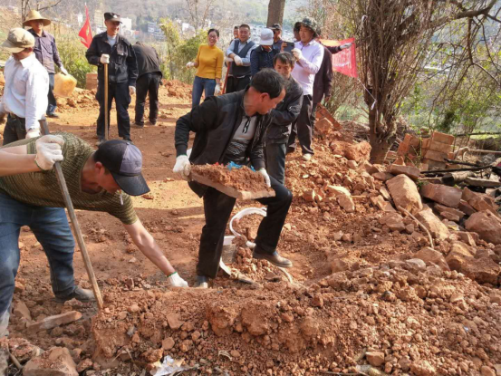 武定县和狮山镇党委政府严格履行脱贫攻坚工作不能搞花拳绣腿,不能搞繁文缛节,不能做表面文章和脱贫攻坚工作要实打实干的承诺。狮山镇副镇长聂开看在眼里,急在心头,盘算着怎样才能让廖桂军一家住上安全、稳固的房屋。因四类重点对象的CD级危房拆除重建资金有限,所以平整土地挂包帮干部和村委会自己干,建房补助资金不够部分帮扶单位和村委会想办法。