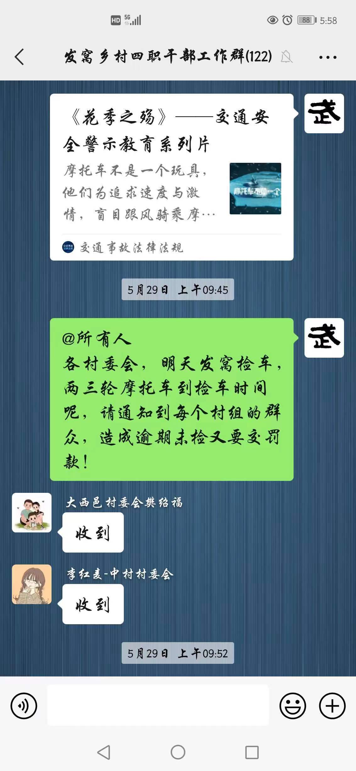 为确保广大群众对此次摩托车年检活动的知晓度,发窝派出所利用打电话通知村委会及每个村组干部、周末放假中小学生给家长带话、进村入户宣传、转发朋友圈、微信群发等不同方式进行宣传,在办理摩托车年检业务的同时,发窝派出所民警辅警对每一个前来办理车检业务的群众开展交通安全劝导及宣传教育,解答群众车管业务、交通违法等疑问,灌输平安出行的安全理念。