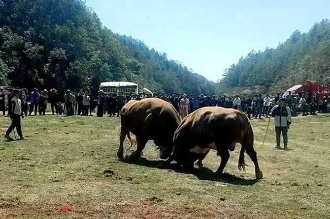 除了赏花、品特产、看表演,此次桃花节更是有精彩纷呈的斗牛、斗羊、斗鸡比赛、负重登山比赛同时上演。“牛博士”“羊秀才”“鸡专家”们互不相让,纷纷使出自己的看家本领,头顶、角扎、直冲、侧撞……斗得难分难解,斗到激烈时,观众们纷纷鼓掌高呼,现场气氛惊险刺激。