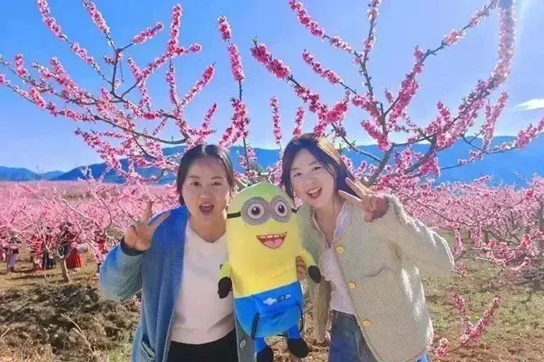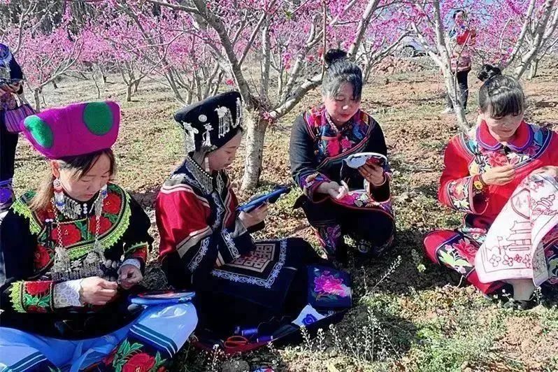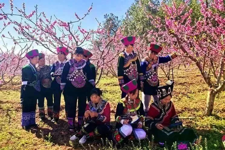 清晨的阳光洒满桃林,500余亩桃花一同绽放出娇美的容颜,像粉色的云海点缀在山林之间,让人心醉神迷。发窝乡代家村冬桃基地也迎来了第一批慕名而来的游客,他们穿着不同民族的服饰,穿梭在桃林中赏花、拍照、记录着美景,还有一众绣娘比着真花绣“假花”,好不热闹。