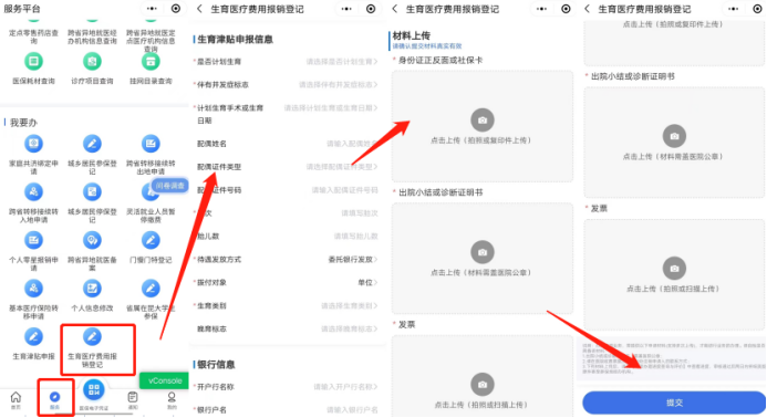 2、点击【服务】进入办理页面,点生育医疗费用报销登记;填写申报信息,带“*”项为必填项,置灰项根据已有信息自动导入,不能填写,只能查看,其他为选填;点击【提交】可以提交保存填写的生育津贴申报信息。